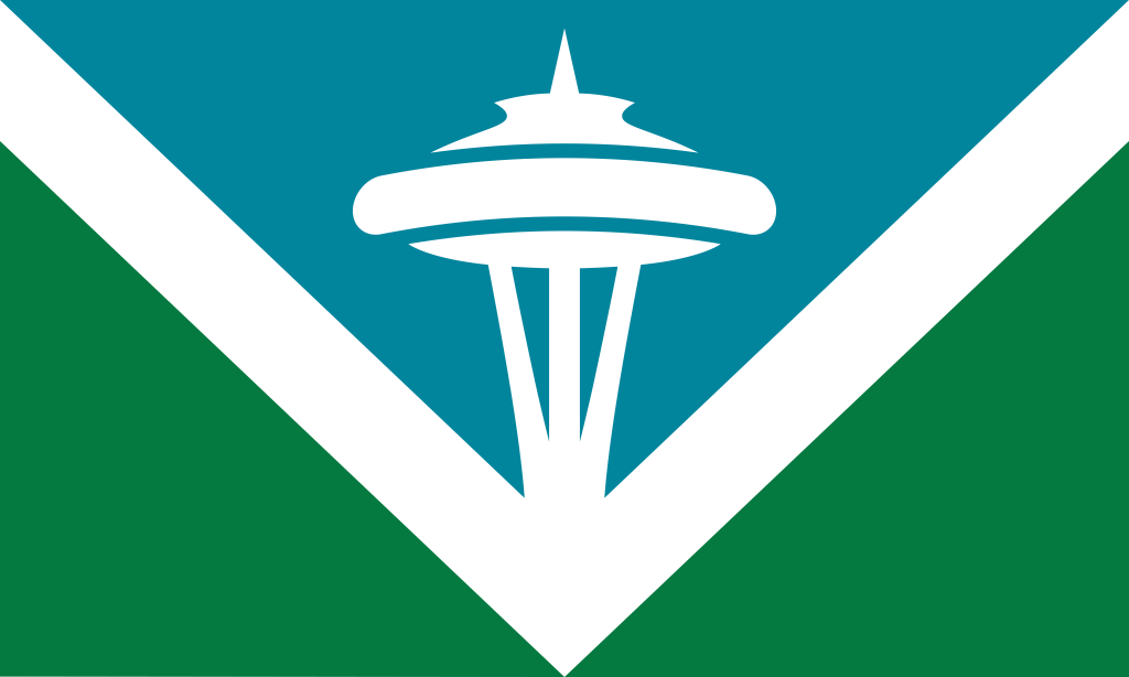 第 59 届年会会旗除延续北美旗帜学协会(NAVA)会旗的 V 形设计外,会旗融入了主办城市西雅图的地理与自然特征,以蓝色、白色、绿色为主要颜色,中间绘制出西雅图著名地标建筑——太空针塔。
