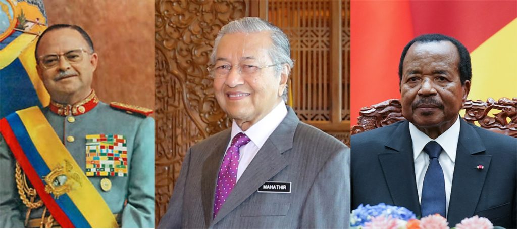 自左至右:厄瓜多尔前军人总统吉列尔莫·罗德里格斯·拉腊(102)、马来西亚前总理马哈蒂尔(100)、喀麦隆总统保罗·比亚(92)。