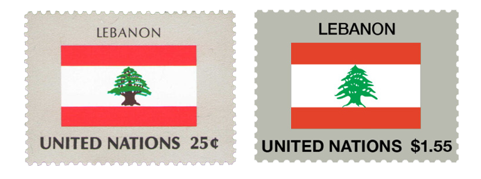 🇱🇧 黎巴嫩国旗邮票曾在 1988 年发行,当时国旗中央雪松图案为树冠绿色、树干棕色,1995 年黎巴嫩国旗将中间的雪松图案全部改为绿色。