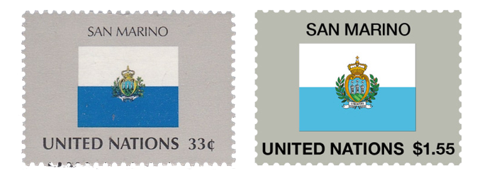 🇸🇲 圣马力诺国旗邮票在 1999 年首次发行,2011 年圣马力诺国旗对现有颜色及中央的国徽图案做出优化修改。