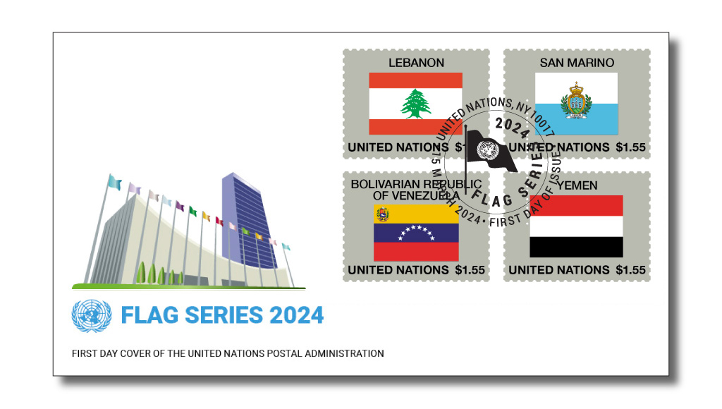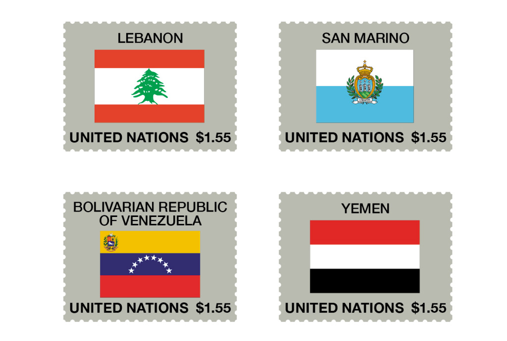 3 月 15 日,联合国邮政管理处发行了一套国旗系列邮票,总共一组 4 枚(一版 16 枚邮票),四枚邮票图案为黎巴嫩、圣马力诺、委内瑞拉、也门四个国家的国旗。这是联合国邮政自 1980 年起发行会员国国旗邮票系列以来的第 58 组。这四枚国旗邮票与其各自上一次发行相比,均因数年前修改国旗图案或政权合并而重新发行。此外这组邮票还发行了首日封和邮折。
