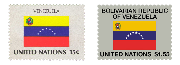 🇻🇪 委内瑞拉国旗邮票在 1980 年发行的首套会员国国旗邮票就有出现,当时的国旗中间是 7 颗五角星,2006 年委内瑞拉国旗将中间的 7 颗五角星增至 8 颗,即加入一颗代表埃塞奎博的五角星(该地也是委内瑞拉与圭亚那的领土争议地区,即「埃塞奎博圭亚那」,去年年底这两口子差点打起来了)。