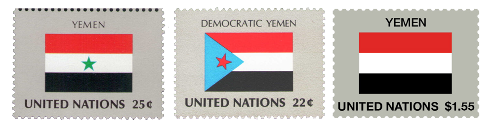 至于 🇾🇪 也门,1987 年发行的国旗邮票中就有也门民主人民共和国(南也门)国旗,次年 1988 年发行阿拉伯也门共和国(北也门)国旗邮票,1990 年南北也门统一成立了也门共和国,统一使用红白黑三色旗。