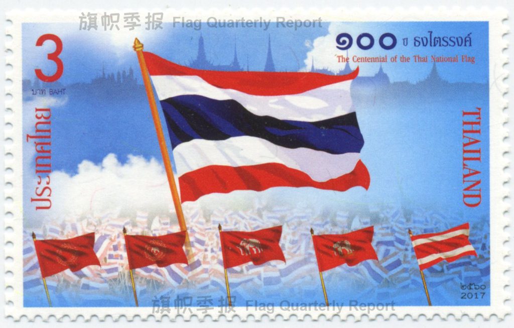 2017 年 9 月 28 日,🇹🇭 泰国邮政发行了国旗 100 周年纪念邮票,面值为 3 泰铢。邮票图案除了中间飘扬的泰国国旗,下方为五面自 1782 年却克里王朝统治以来泰国历史上使用过的国旗,1917 年泰国国王拉玛六世下令改用红白蓝三色国旗至今。泰国政府自 2017 年起设立每年的 9 月 28 日为国旗日,以此表达对国旗的爱护与尊重,以及对国旗设计者拉玛六世的纪念。(图源 博主收藏)