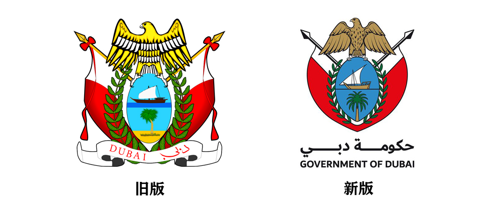 迪拜新版徽章是由原来徽章的基础上优化而来,除了去掉下方写有迪拜字样的飘带,猎鹰、帆船、棕榈及两旁的迪拜旗帜(新版去掉了旗杆顶端的红色流苏)等元素仍然保留,总体上比原版圆润了许多。
