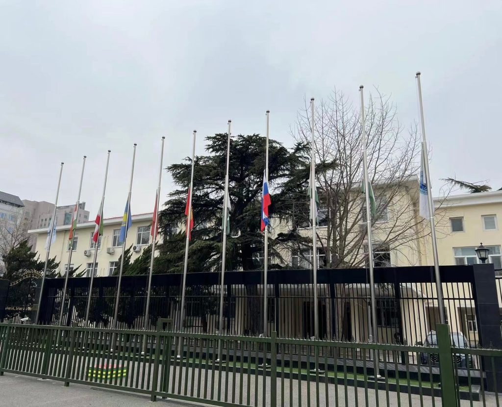此外,据上海合作组织官方微博发布图文称,位于北京的上海合作组织秘书处将上合会旗及各成员国国旗降半旗。