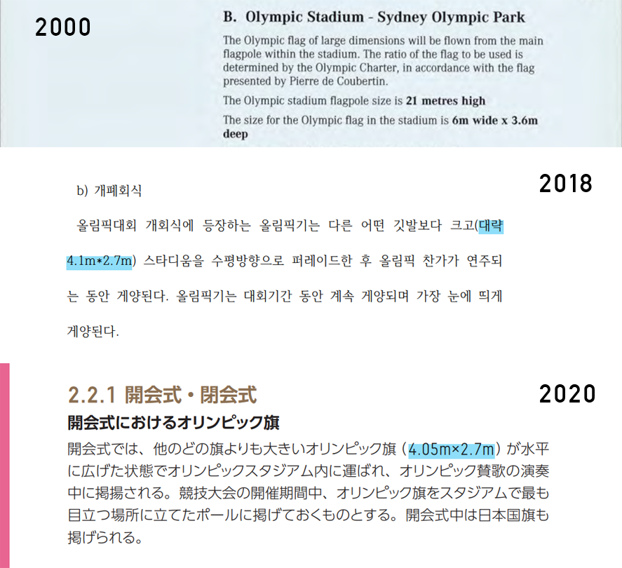 2000☀️/2018❄️/2020☀️:明确提到了开闭幕式的奥运五环旗尺寸,分别是 6m×3.6m、4.1×2.7m、4.05×2.7m